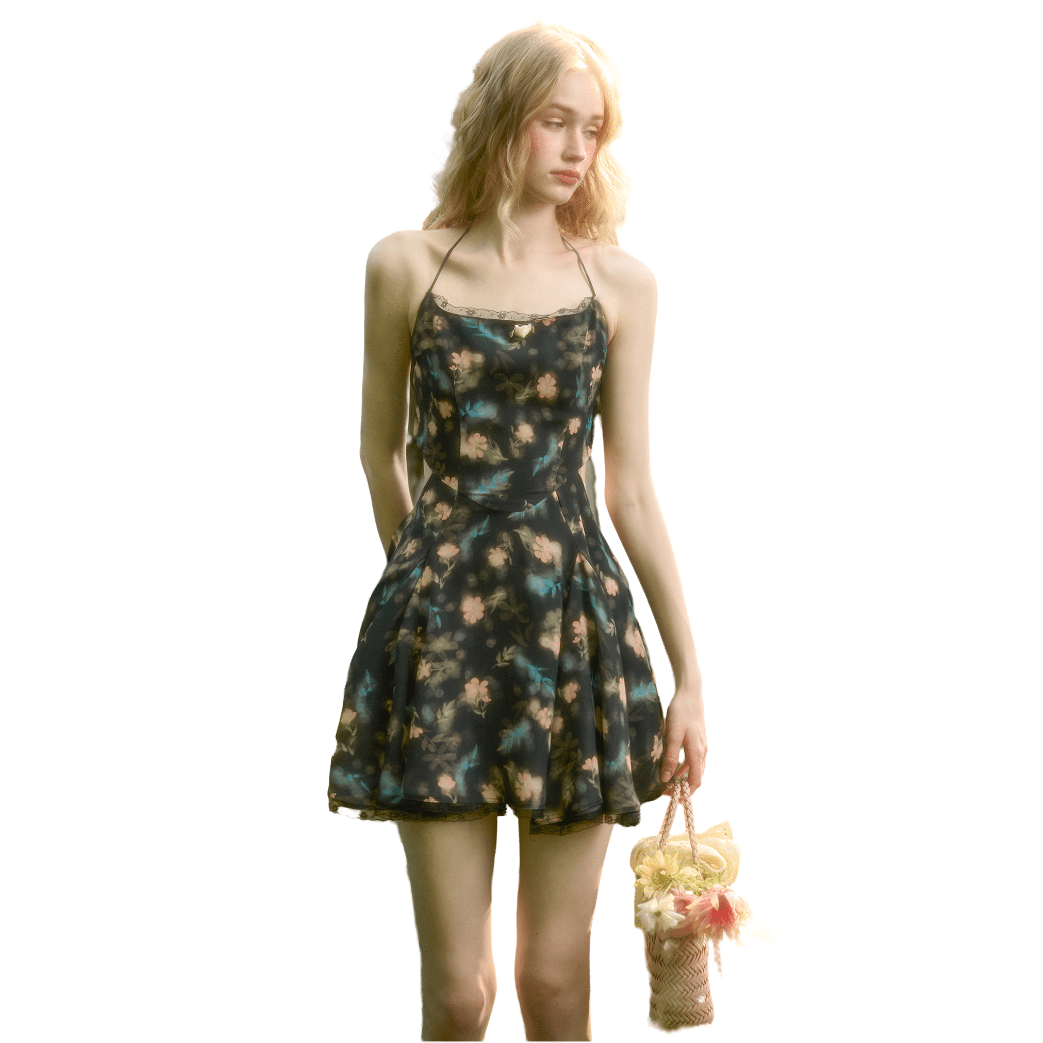 Off-shoulder Contrasting Floral And Leaf Silk Dress In Black
