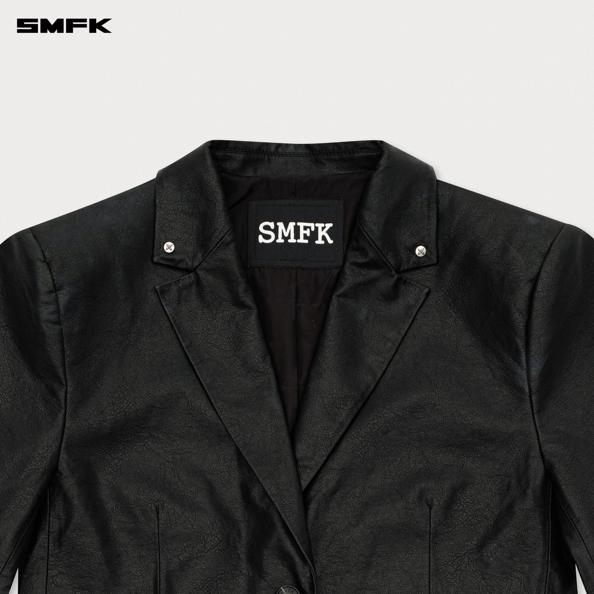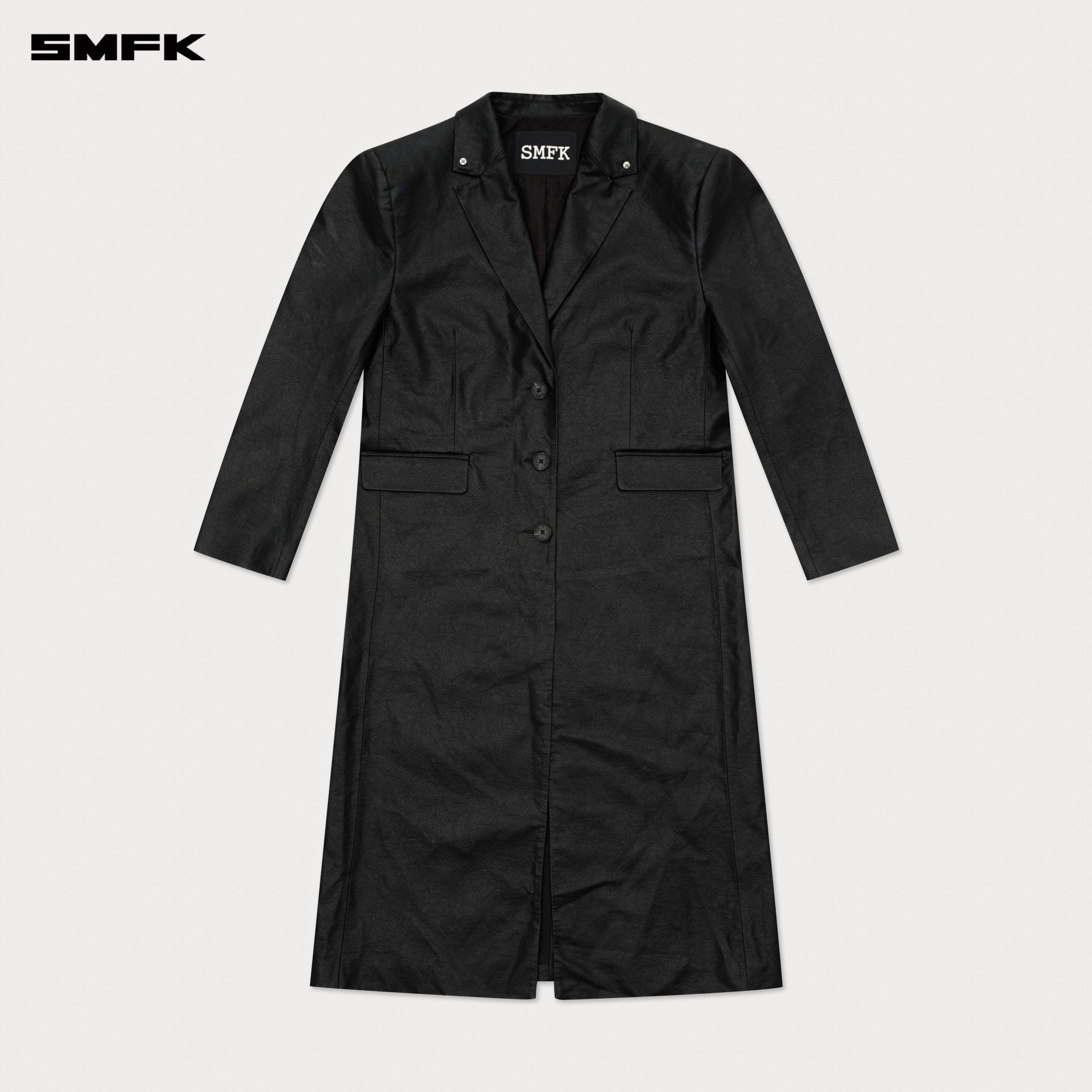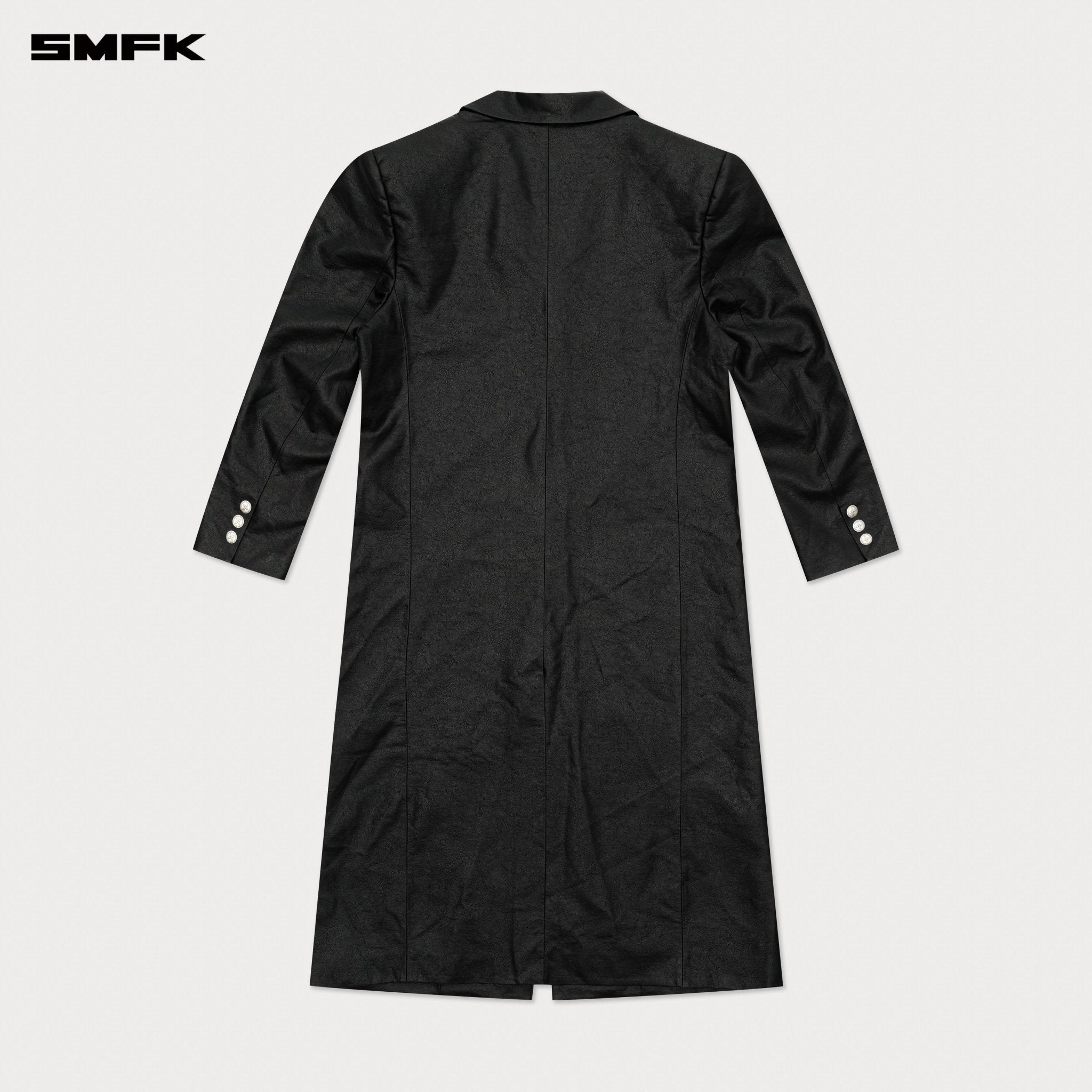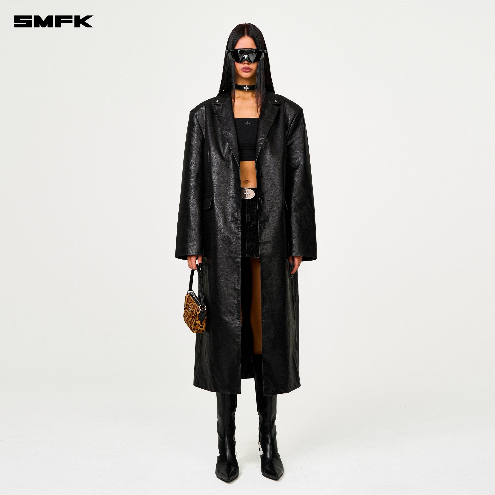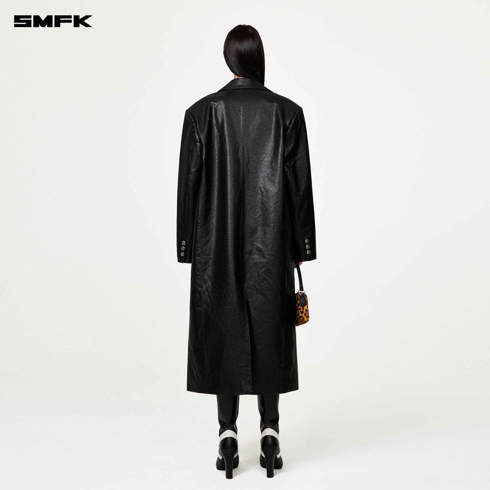 - Design: The SMFK Designer Series, with its more streamlined design, focuses on the structure of the silhouette and the combination of fabrics. The first oversized coat in the SMFK collection features a silhouette inspired by the oversized suits of the same year. The collar is adorned with two COMPASS rivets, and the cuffs have been changed to metal snap buttons, giving the style a more rock 'n' roll vibe. For the shoulder padding of the coat, multiple layers of hand-compound cotton pads are used, providing support and connection for the entire shoulder area. This design allows for a comfortable wear while maintaining a double-sharp and freely movable shoulder pad.