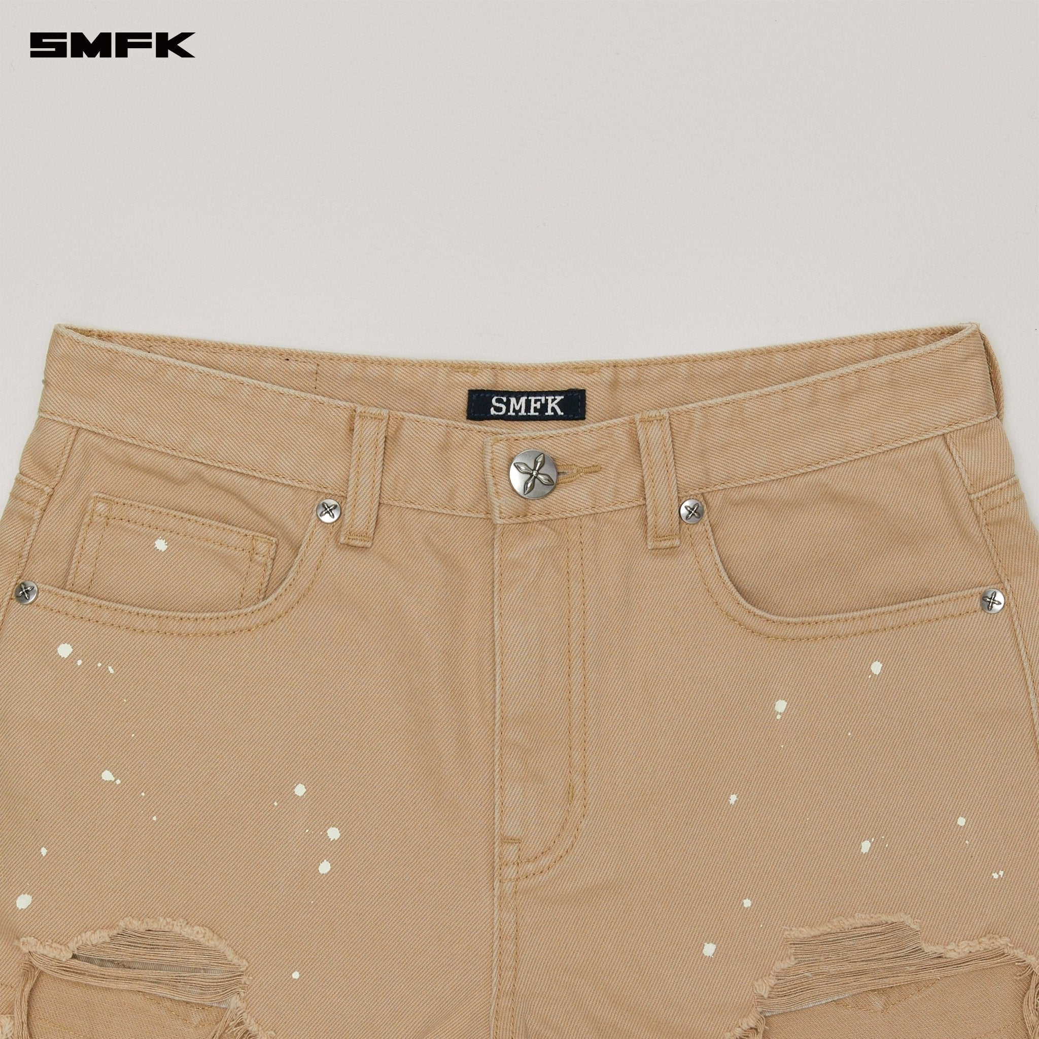 Design: The SMFK COMPASS Classic Collection embodies the timeless beauty of cotton-based fabrics, showcasing the material’s inherent appeal through the brand’s signature black-and-white and earth-tone solid colors, as well as wild camouflage and animal-print patterns, highlighting the artistry of modern printing techniques. SMFK ICON's first mid-rise denim shorts, remains a staple to this day. Featuring a regular inseam, the hem is reinforced with anti-tear stitching for durability. The splatter effects are applied by hand for a unique, artistic touch.