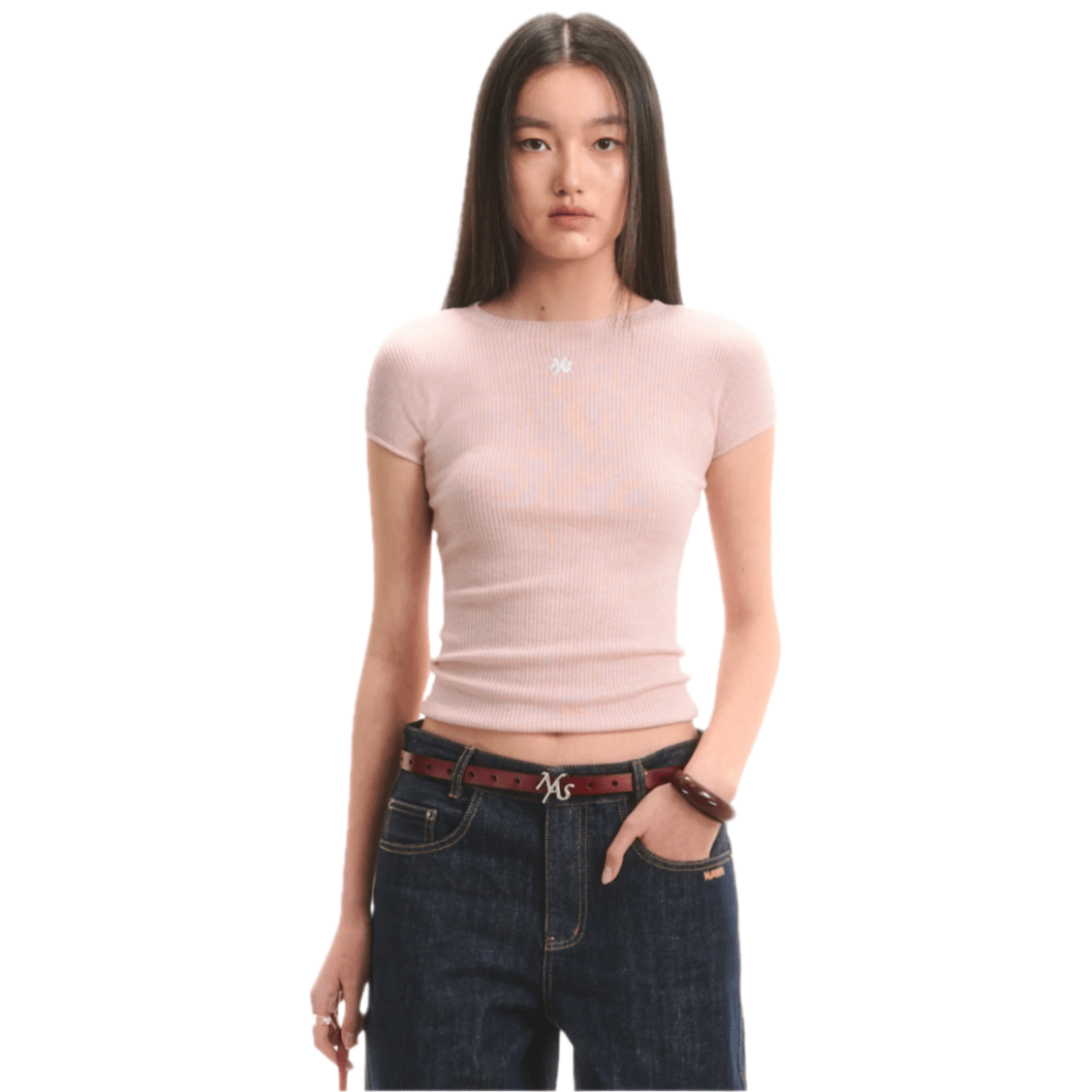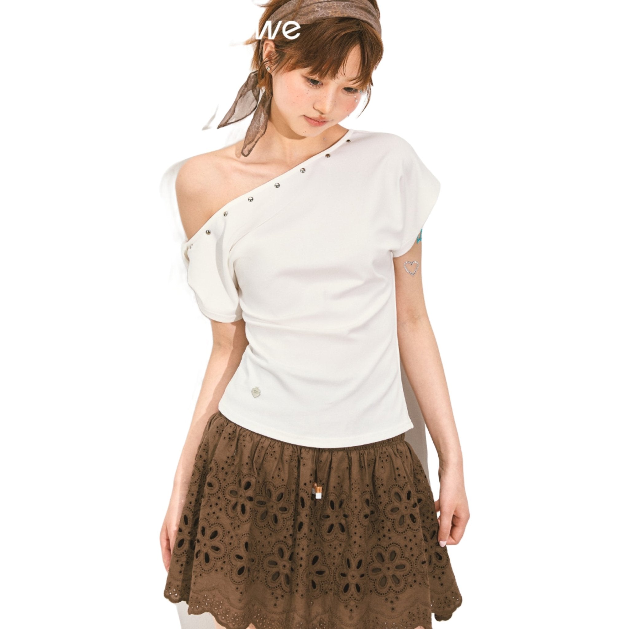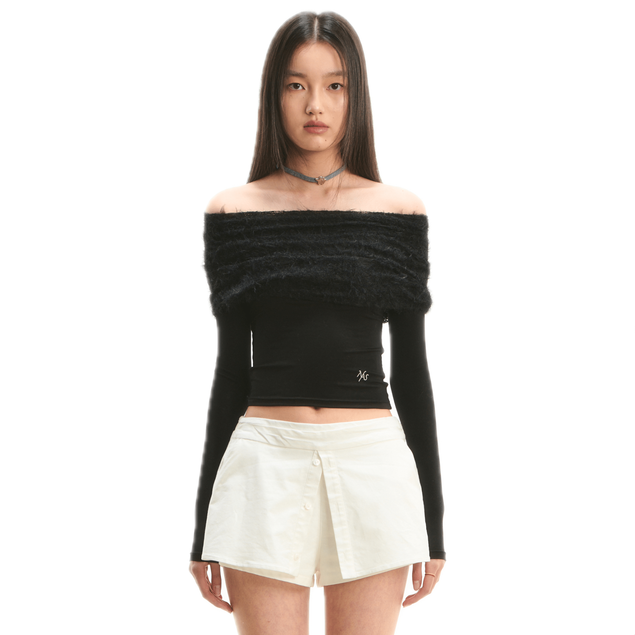 绒感格纹斜肩堆褶长袖T恤灰白格